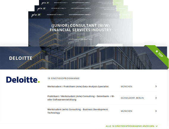Die Nutzer von get in IT interessieren sich für die IT-Kompetenz Ihres Unternehmens. Erzählen Sie Ihre Geschichte! Mit unserer vertikalen Ausrichtung erreicht Ihre Botschaft zielgerichtet & authentisch die IT-Nachwuchskräfte!