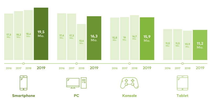 Wie bereits in den vergangenen Jahren haben die Casual und Social Games weiterhin die Nase vorn. Smartphones sind die beliebteste Spieleplattform in Deutschland und haben den PC längst überholt. Den Spielenden wird ein breites Feld an verschiedenen Games eröffnet von dem nicht nur sie profitieren, sondern auch die Entwickler:innen - insbesondere Indie-Studios: Mit kleinem Budget, aber großer Kreativität können sie immer mehr Publikum von ihren Spiele-Ideen überzeugen. Laut der pwc Studie "German Entertainment and Media Outlook 2018-2022" rechnet die Branche mit einer Umsatzsteigerung von 4.929 Mio. € auf voraussichtlich 6.165 Mio. €.