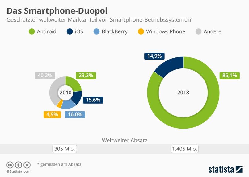 Natürlich kannst Du mit der Zeit zum Allroundgenie werden, im Regelfall fokussierst Du Dich erstmal auf Apps für ein bestimmtes Betriebssystem wie iOS, Android oder Windows Phone. Denn es gibt große Unterschiede, nicht nur bei der technischen Entwicklungsumgebung, sondern auch in Bezug auf das UX-Design und die spätere Vermarktung. Mit ca. 85,1 % (Google) und 14,9 % (Apple) teilen die beiden großen Player den Smartphone-Markt fast vollständig unter sich auf. Die App-Entwicklung für MS Windows führt ein Nischendasein.