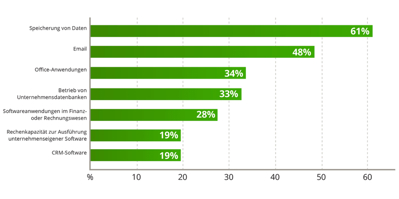 - Software as a Service (SaaS): Hier werden Softwaresammlungen und Anwendungen beispielsweise Tabellenkalkulation und Textverarbeitung – on Demand – in der Cloud angeboten.