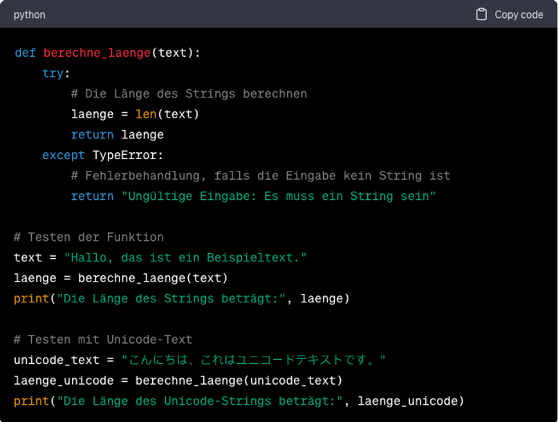 ChatGPT erklärt dazu: "Diese Funktion berechne_laenge(text) akzeptiert einen String als Eingabe und verwendet die len()-Funktion, um seine Länge zu berechnen. Es wird auch eine Fehlerbehandlung durchgeführt, um sicherzustellen, dass die Eingabe ein gültiger String ist. Der Code unterstützt Unicode-Text und kann daher auch mit Zeichen aus verschiedenen Zeichensätzen umgehen."
