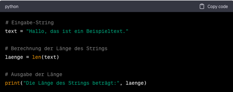 ChatGPT erklärt dazu: "Dieser Code definiert zuerst einen String (text) und verwendet dann die eingebaute Python-Funktion len(), um die Länge des Strings zu berechnen. Schließlich wird die Länge auf der Konsole ausgegeben. Je nachdem, welchen String Sie verwenden, wird die Länge entsprechend angezeigt."