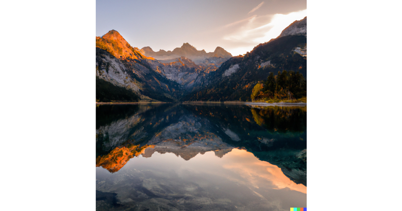 letzten Sonnenstrahlen des Tages einen majestätischen Bergsee in ein funkelndes Meer aus Farben verwandeln. Die umliegenden Bäume und Berge sollten im goldenen Abendlicht leuchten, während sich der Himmel in den tiefsten Blau- und Lilatönen färbt. Dieses Bild soll ein Gefühl von Frieden, Staunen und Entschleunigung vermitteln.