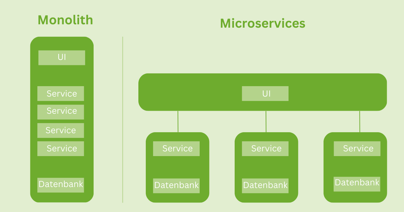Microservices verkörpern eine Architektur-Philosophie, die Anwendungen in kleinen, eigenständigen Diensten organisiert. Diese Dienste können unabhängig voneinander entwickelt, deployt und gewartet werden und interagieren untereinander über plattformunabhängige Schnittstellen. Okay und was heißt das genau? Ein einzelner Microservice macht im Prinzip wenig, aber das macht er dafür ziemlich gut. Heute sind Microservice-Architekturen Standard in der Entwicklung von Webanwendungen. Vielleicht kennst Du es selbst vom Programmieren: Du möchtest am liebsten tausend Funktionen in Deiner Anwendung haben. Und dann stehst Du vor der Herausforderung, wie Du sie am besten gestaltest. Der traditionelle, klassische Weg im Software Development ist die monolithische Architektur. Bei der hängen alle Deine Funktion zusammen und Du hast ein Programm, das alles kann. Eigentlich genau das, was Du willst, oder? Aber was passiert, wenn Du Probleme mit der Datenbank hast oder Dein Design zerschossen ist? Bei Monolithen betreffen Ausfälle oft das ganze System. Und wenn das down ist, geht nichts mehr. Wäre doch schlau, die einzelnen Funktionen voneinander zu trennen und separat laufen zu lassen. Im Worst Case wäre dann z.B. in dem Webshop “nur” die Such-Funktion kaputt, die Kund:innen können aber fröhlich weiter shoppen.