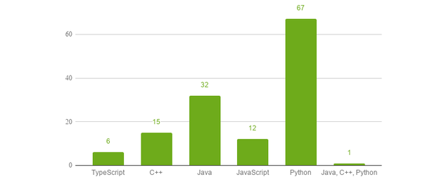 Ziel war es, einen interstellaren Algorithmus zu entwickeln, der die kürzeste Route zwischen der Erde und dem Planeten b3-r7-r4nd7 findet. Ihr konntet dabei zwischen den Programmiersprache Java, JavaScript, TypeScript, C++ und Python wählen. 67 Coder entwickelten einen Algorithmus in Python. Einer von Euch hat uns sogar mit Lösungsvarianten in gleich 3 Programmiersprachen überrascht: Java, C++ und Python. Hier sind nochmal die gewählten Technologien aller Teilnehmer in der Übersicht: