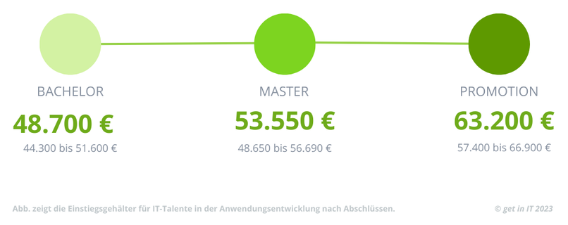 Die meisten Anwendungsentwickler:innen verdienen zwischen 50.900 und 58.600 €, wenn sie nach dem Masterstudium und ersten Praktika ins Berufsleben starten. Mit einem Bachelor bekommst Du in der Anwendungsentwicklung zum Einstieg im Schnitt ein Gehalt zwischen 46.200 und 53.200 €. In einer IT-Trainee-Position kann das auch ein bisschen geringer ausfallen, in der Regel so ca. zehn Prozent. Dafür kannst Du so meist eine Menge lernen und das Ganze als Weiterbildung mitnehmen.
