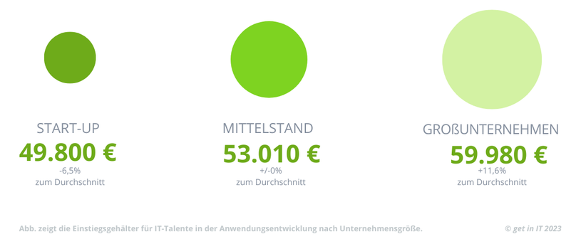 Natürlich macht es einen Unterschied, ob Du im Start-up, im Mittelstand oder im etablierten Großunternehmen arbeitest. Bei einem großen Konzern verdienen Anwendungsentwickler:innen im Durchschnitt 59.000 €. Im Mittelstand bezahlen Firmen rund 54.700 € an ihre Softwaredeveloper. Im Start-up legst Du mit einem Einstiegsgehalt von rund 49.200 € los. Hier spielt bei der Wahl unter anderem Deine persönliche Gewichtung der Faktoren Freiheit und Sicherheit eine Rolle.