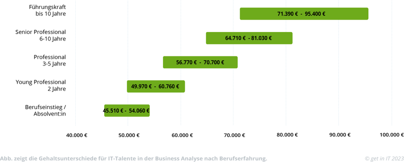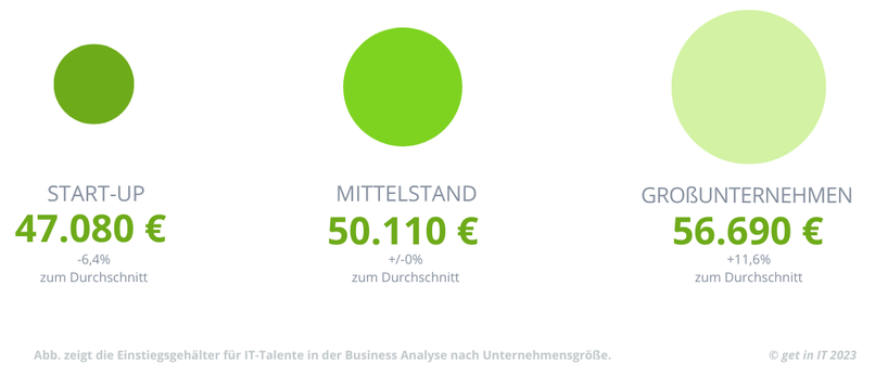 Als Business Analyst:in stehen die Chancen gut, dass Du in einem großen Konzern einsteigst. Hier erwartet Dich ein Gehalt zwischen 53.400 und 61.500 €. Aber auch im Mittelstand kannst Du als Business Analyst:in arbeiten, z.B. bei Dienstleistern, etablierten Online-Unternehmen und Systemhäusern. Hier ist das Jahresbrutto etwas niedriger und liegt zwischen 49.400 und 56.900 €. Noch etwas weniger Gehalt bekommst Du bei Start-ups, im Schnitt 47.900 € pro Jahr.