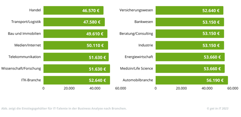 Mit einem Brutto für Einsteiger:innen von durchschnittlich 59.600 € liegen die Energiewirtschaft, die Industrie und die Medizin-Branche derzeit auf Platz 1 der am besten zahlenden Branchen für Business Analyst:innen. Dahinter liegen aktuell neben Wissenschaft und Forschung auch die Beratung mit 56.900 € sowie die Automobilindustrie mit 58.000 €. Am unteren Ende der Skala stehen der Handel mit 47.300 € Jahresbrutto und Transport- und Logistikunternehmen mit 46.800 €.