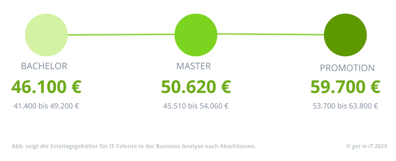 Mit einem Bachelor-Abschluss steigst Du als Junior Business Analyst:in mit einem Gehalt zwischen 45.000 und 51.800 € ein. Hast du einen Master gemacht, liegt Dein Einstiegsgehalt noch einmal höher. Dann kannst Du mit 49.500 bis 57.000 € rechnen.
