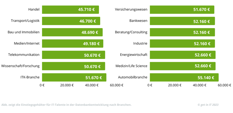 In der Automobilbranche heißt es für Dich als DB-Dev: Anschnallen und mit einem Einstiegsgehalt von 62.200 € schon recht hoch im Branchenvergleich einsteigen! Der Bereich Medizin / Life Science entlohnt Deinen behutsamen Umgang mit den hochsensiblen Gesundheitsdaten mit einem Top-Jahresgehalt von ca. 63.900 €, so wie auch Industrie und Energiewirtschaft. Die Nachhut in der Bezahlung bilden Transport und Logistik und der der Handel mit einem Jahresgehalt von 50.200 € bzw. 50.800 e beim Berufseinstieg.