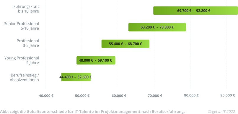Je mehr Berufserfahrung Du als IT-Projektmanager:in sammelst, desto höher klettert auch Dein Gehalt. In den ersten 2 Jahren im Job bekommst Du im Schnitt 55.900 €. Gute Möglichkeiten für Gehaltssprünge sind nach 3 bis 5 Jahren und dann wieder nach 6 bis 10 Jahren. Als IT-Projektleitung rücken sechstellige Gehälter in Sicht. Auch wenn Du als IT-Projektmanager:in Dein eigenes Team leitest, wirkt sich das positiv auf Dein Gehalt aus.