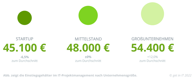 Für welches Unternehmen Du Dich entscheidest, macht einen Unterschied von ca. 10.000 € pro Jahr aus. Am wenigsten zahlen Start-ups, die noch in der Aufbauphase sind und in der Regel noch nicht so viel Geld in ihr Personal investieren können. Hier bekommst Du rund 50.200 € pro Jahr. Bei Mittelständlern liegen die Gehälter für IT-Projektmanager:innen höher: Hier kannst Du mit 51.800 bis 59.700 € rechnen. Am besten zahlen die großen Konzerne, die oft mehrere Entwicklungsabteilungen haben. Einstiegsgehälter für IT Project Manager zwischen 56.000 und 64.500 € sind hier an der Tagesordnung. Große Unternehmen bieten Berufsneulingen außerdem am häufigsten strukturierte Einstiegsprogramme ins Projektmanagement.