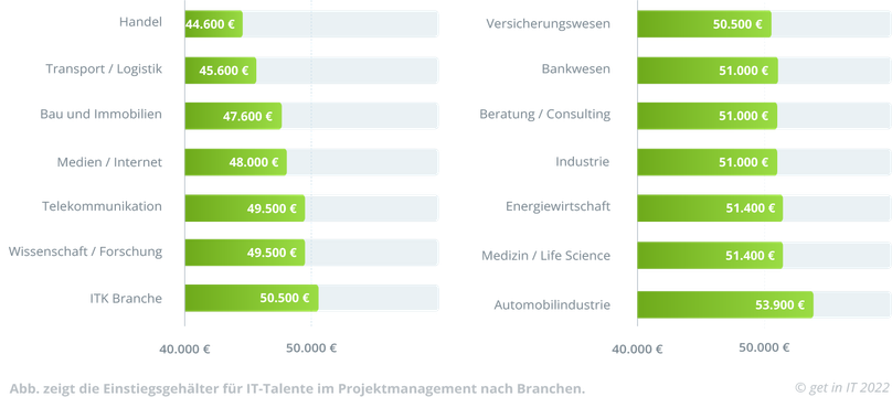 Am wenigsten zahlen Unternehmen in der Logistik, nämlich rund 49.000 pro Jahr. Auch der Handel liegt eher unter dem Durchschnitt. Hier liegt das Einstiegsgehalt für IT-Projektmanager:innen bei rund 49.600 €.