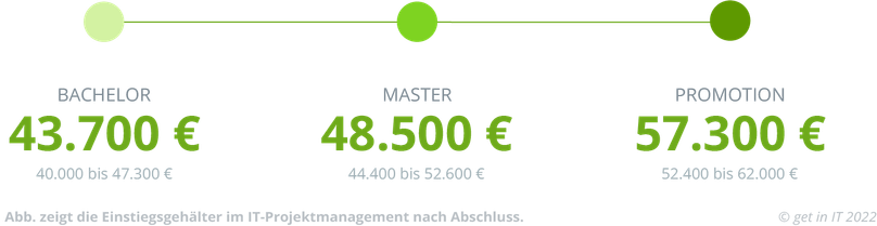 Bachelor oder Master: Welchen Abschluss du mitbringst, macht beim Einstiegsgehalt für IT Projektmanager:innen einen Unterschied von rund 5.000 € pro Jahr aus. Während Du mit einem Bachelor-Abschluss mit 50.700 € ins IT-Projektmanagement einsteigst, sind es mit dem Mastertitel 55.900 €. Trainees bekommen für die Zeit ihres Traineeships etwas weniger Gehalt: Mit Bachelorabschluss sind es ca. 45.700 €, mit Masterabschluss 49.500 €.
