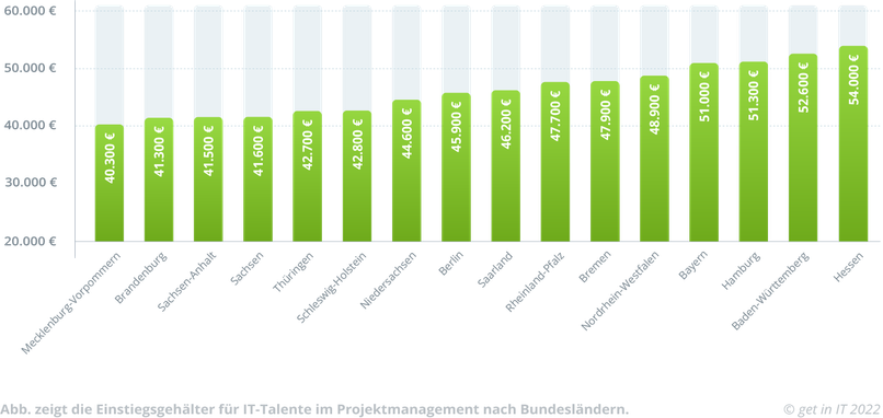 Spitzenreiter bei den Gehältern für IT-Projektmanager:innen ist 2025 Hessen mit 62.400 € brutto. Das liegt auch an der Main-Metropole Frankfurt. Auf den Plätzen 2 und 3 folgen Bayern und Baden-Württemberg. Auch in Niederdachsen und Hamburg verdienst Du über 60.000 € im Jahr.