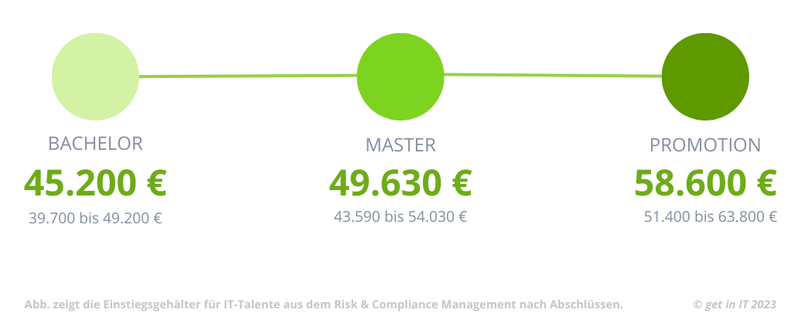 Im Risk & Compliance Management kommt es neben Deinem Können besonders auf Deine Erfahrung an: Je mehr Schwachstellen und potenzielle Rechtsfallen Du kennst, desto besser. Entsprechend ist hier ein Start mit Master-Abschluss, der zwischen 48.300 € und 55.600 € einbringt, schon üblicher als ein Einstieg mit Bachelor-Zeugnis in der Tasche – wofür es von 43.800 € bis 50.500 € gibt. Mit Promotion kannst Du sogar mit einem Einstiegsgehalt zwischen 56.800 € und 65.400 € rechnen.