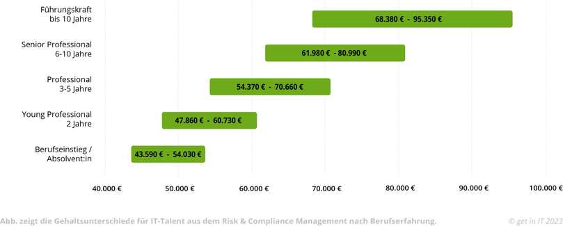 Die Unterschiede in der Bezahlung von Bundesland zu Bundesland spiegeln ebenfalls einen Trend wider, der über Deinen speziellen IT-Job hinausgeht: Hessen, BaWü und Bayern geht es einfach am besten, weshalb es dort auch mit 57.000 € bis 58.000 € das höchste Gehalt fürs Risk & Compliance Management gibt. Umgekehrt verdienst Du in den strukturschwachen östlichen Bundesländern nicht ganz so viel: Von 45.100 € in Mecklenburg-Vorpommern bis 47.700 € in Sachsen und Thüringen. Dafür sind dort Deine Lebenshaltungskosten nicht so hoch wie in westdeutschen Großstädten.