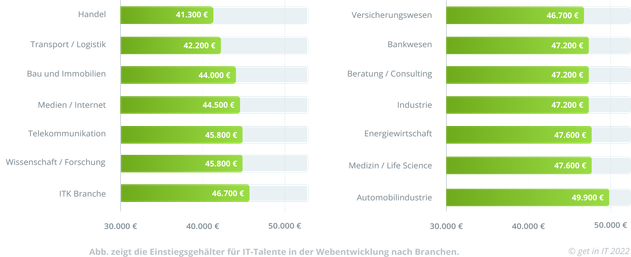 - Am meisten zahlt die Life-Science-Branche jungen Talenten in der Webentwicklung: Hier geht’s schon mit 53.300 € los.
