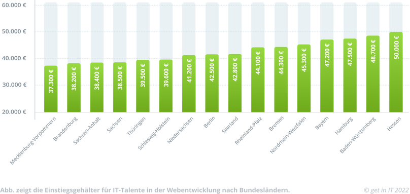 Auch die Region, in der Du tätig bist, hat Einfluss auf Dein Einstiegsgehalt im Web Development: Deutschlandweit sind zwischen 41.400 € in Meck-Pomm und 53.300 € in Hessen drin. Auch in Baden-Württemberg (52.300 €) und Bayern (51.900 €) verdienst Du im Bundesvergleich überdurchschnittlich gut. Im Osten gibt es in der Regel mit 41.400 € bis 43.800 € nicht ganz so viel. Dafür sind die Mieten und Lebenshaltungskosten dort meist günstiger, also gleicht sich das wieder aus.