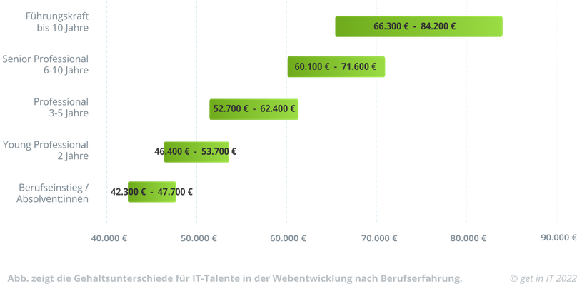 Im Web Development kannst Du Dich in ordentlichen Schritten weiterentwickeln – fachlich wie gehaltlich. Mit jedem Jahr an Berufserfahrung und zusätzlicher Spezialisierung wächst auch Dein Gehaltspotenzial. Vor allem, wenn Du Verantwortung für Budgets oder Mitarbeiter übernimmst, kannst Du mit deutlichen Gehaltssprüngen rechnen.