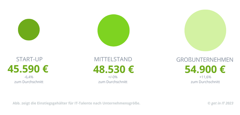 Neben den bereits genannten Faktoren wie der Branche und dem IT-Schwerpunkt beeinflusst die Größe Deines Arbeitgebers die Zahl auf Deinem Gehaltszettel. Je etablierter das Unternehmen und je größer die Anzahl der Mitarbeitenden, desto höher ist meist auch das Gehalt. Der Vorteil bei kleineren Unternehmen und Mittelständlern sind die oft breiteren Tätigkeitsfelder, mit denen Du Dich beschäftigst. Auch was die persönlichen Entwicklungsmöglichkeiten angeht, hast Du hier in der Regel gute Aussichten. Im Start-up (bis 250 Mitarbeitende) liegt das Einstiegsgehalt für IT-Talente bei 46.400 €. Anders als in Großkonzernen bekommst Du hier früher die Chance, verantwortungsvolle Aufgaben und Projekte zu übernehmen. In Großunternehmen (ab 1.000 Mitarbeitenden) haben Berufseinsteiger:innen mit 55.600 € Einstiegsgehalt knapp 10 k mehr am Ende des Monats auf dem Gehaltszettel.