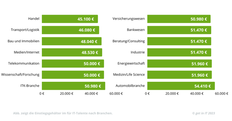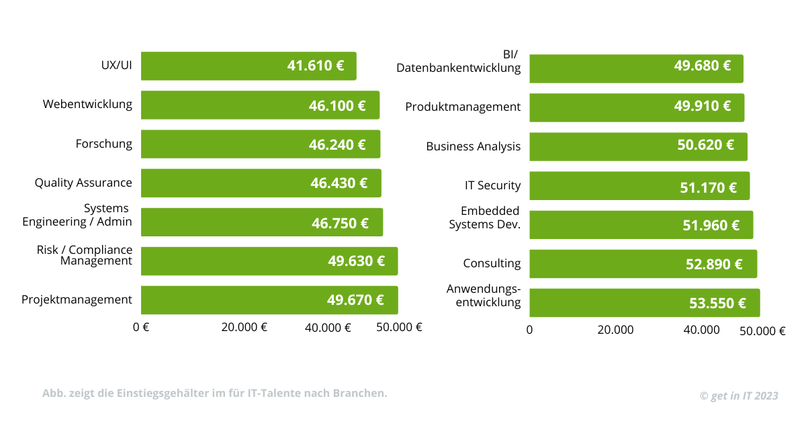 Weißt Du, in welchen Beruf Du nach Deiner IT-Ausbildung einsteigen möchtest? Als Spezialist:in im Bereich IT-Security, Embedded Systmems Devevelopment oder auch als Datenbankentwickler:in erwartet Dich mit Einstiegsgehältern von deutlich über 55.000 € im Vergleich zu anderen IT-Schwerpunkten ein vergleichsweise hohes Einstiegsgehalt. Im User Experience-Design oder User Interface-Design hingegen kommst Du auf ein Jahresgehalt von durchschnittlich 44.300 €.