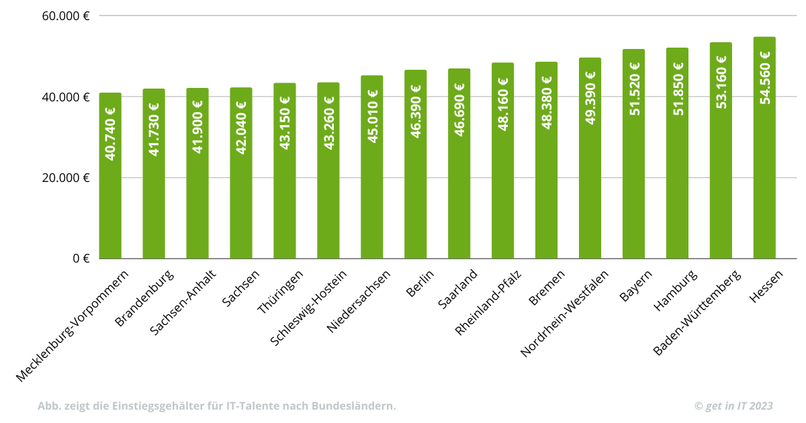 Egal ob Nordlicht, Schwabe, oder Rheinländerin: Wenn Du noch unentschlossen bist, wo Du arbeiten möchtest, oder ob es in der Heimat doch am schönsten ist, dann hilft Dir diese Statistik, eine Entscheidung zu treffen. Bei der Bezahlung von IT-Fachkräften, sind die Bundesländer Baden-Württemberg, Bayern und Hessen ganz vorne dabei. Mit bis zu 60.000 € erwartet Dich hier ein vergleichsweise hohes Einstiegsgehalt, wohingegen in Mecklenburg-Vorpommern und Brandenburg die niedrigsten Gehälter gezahlt werden. Hier liegt das Einstiegsgehalt im Median bei etwa 44.800 €.