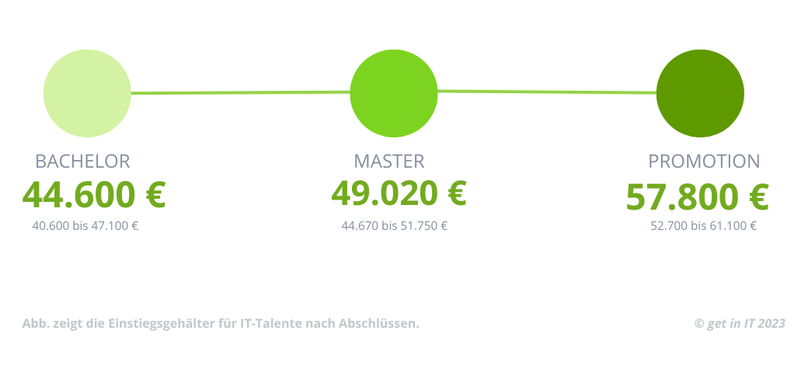 Im Vergleich zu Deinen praktischen IT-Skills spielen formale Qualifikationen in der IT – besonders im Vergleich zu anderen Berufen wie Juristen oder Ingenieurinnen – eher eine geringere Rolle. Wenn es aber um die Höhe Deines Einstiegsgehalts geht, macht Dein Studienabschluss allerdings schon einen Unterschied aus. Je nach Abschluss sind hier Unterschiede von mehreren tausend Euro pro Jahr möglich. Dein anfänglich niedrigeres Gehalt mit Bachelor-Abschluss von 46.300 € oder auch als Fachinformatiker:in gleicht sich im Laufe Deiner IT-Laufbahn allerdings häufig an das von Master-Absolvent:innen an. Mit einem Bachelor-Abschluss sammelst Du schon zwei Jahre Berufserfahrung, während Du mit einem Masterabschluss noch zwei weitere Jahre in Deine Ausbildung investieren würdest. Mit einem Master beläuft sich Dein Einstiegsgehalt auf rund 51.500 €. Während im Bereich Forschung ein Masterabschluss oder eine Promotion teilweise sogar Voraussetzung ist, zählt in der Programmierung hingegen vorrangig Deine Praxiserfahrung.