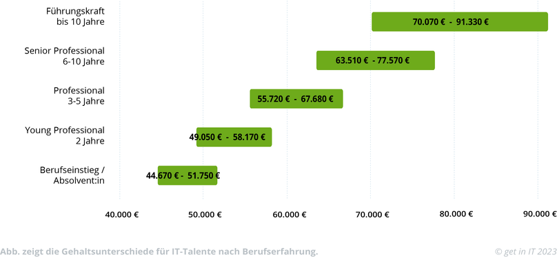 What’s next? Informatik-Talente haben im nationalen Vergleich überdurchschnittlich gute Gehaltsaussichten. Beim Berufseinstieg ist ein Einstiegsgehalt von rund 51.500 € möglich. Als IT Professional hast Du schon Berufserfahrung gesammelt und Deine Verdienstmöglichkeiten steigen dementsprechend. Nach 3-5 Jahren hast Du häufig die 65.000 €-Marke geknackt. Als IT-Spezialist, IT-Projektmanagerin oder Führungskraft kannst Du Dich auf wesentlich höhere Gehaltsschecks einstellen. Mit Personalverantwortung und höherer Berufserfahrung bieten sich Dir je nach Job attraktive Gehälter im sechstelligen Bereich.